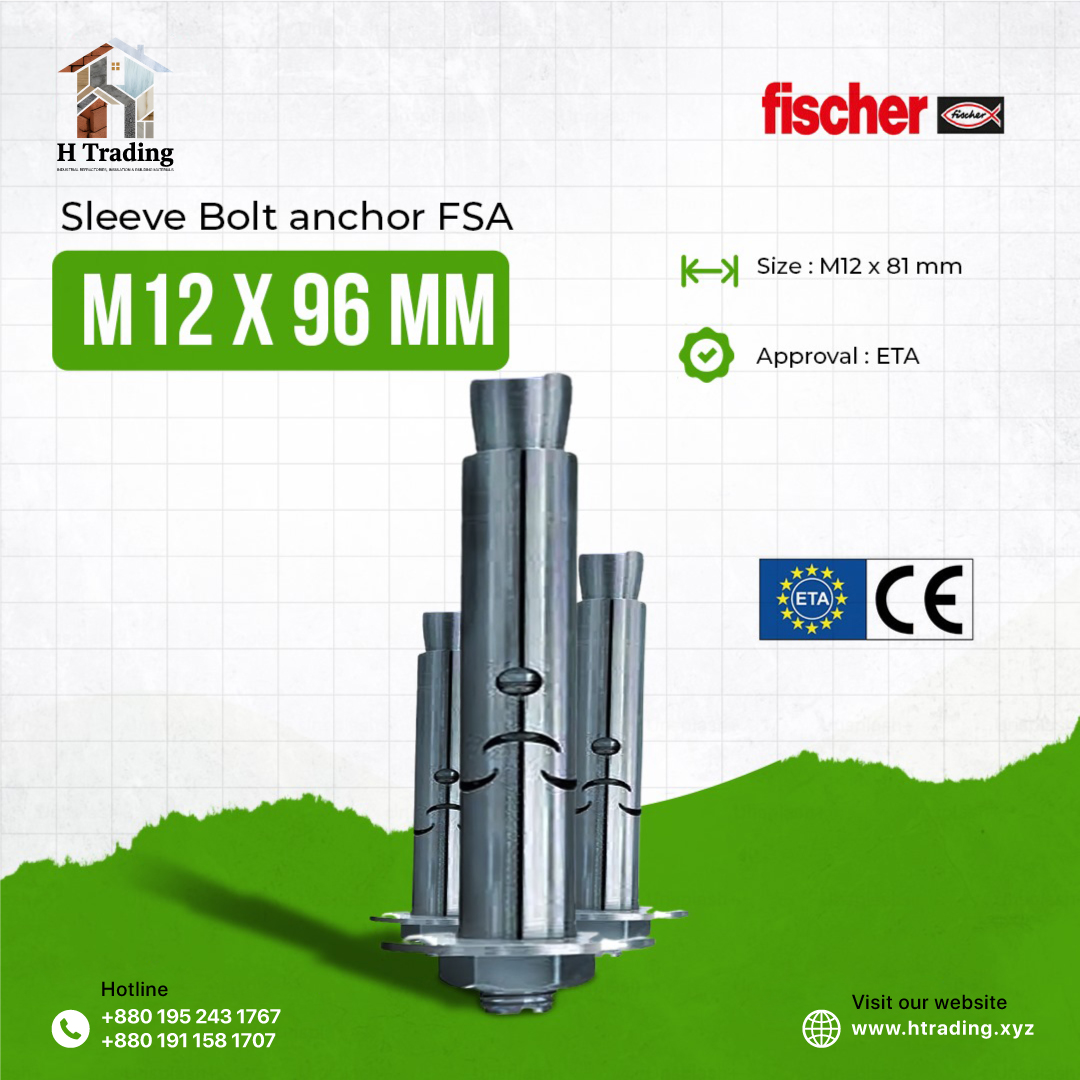 The fischer sleeve anchor FSA-S is a zinc-plated steel anchor with a hexagonal screw for structural anchorings. The fischer sleeve anchor is ideal for the fixation of non-safety-relevant anchorings such as cantilevers, handrails, cable trays, and temporary anchors in non-cracked concrete. The optimised anchor geometry offers a high shear load resistance and a high level of safety. The FSA-S is installed in a time-saving push-through installation. During tightening, the cone is pulled into the expansion sleeve and expands it against the drill hole wall. The recesses act as a crumple zone to take the torque slippage. The detachable screw connection allows for surface-flush removal.Advantages: